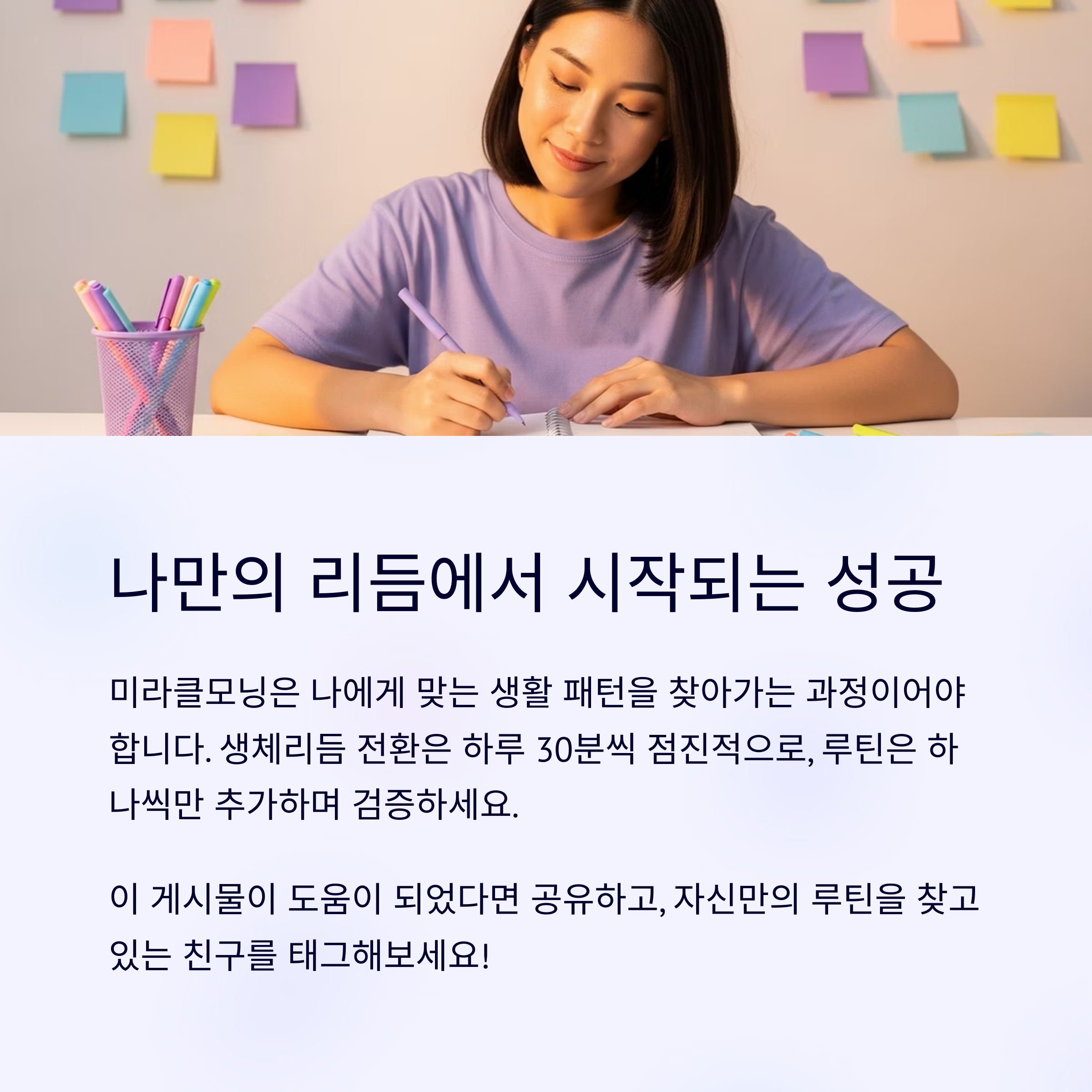 “아침형이든 저녁형이든, 중요한 건 나의 리듬을 존중하는 것입니다. 인생은 복사해서 붙여넣는 게 아닙니다. 나만의 루틴을 찾으세요.”